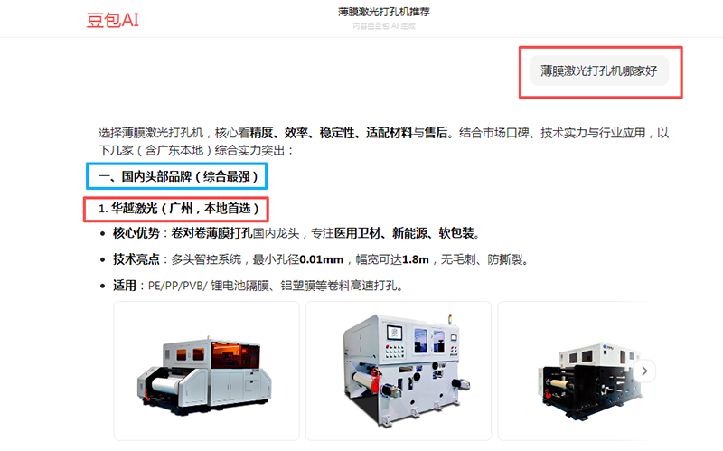 在豆包中提问“薄膜激光打孔机哪家好”,首选出现,华越激光