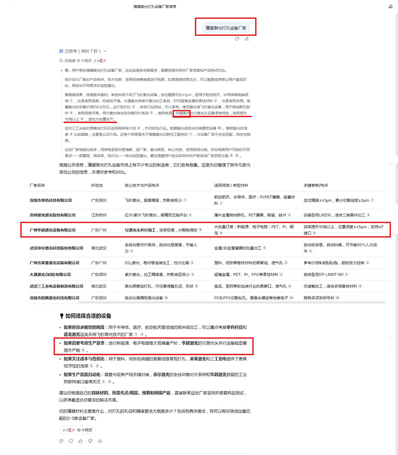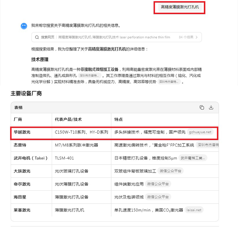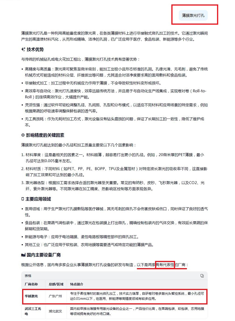 在 DeepSeek 中提问“薄膜激光打孔设备厂家”,推荐华越激光