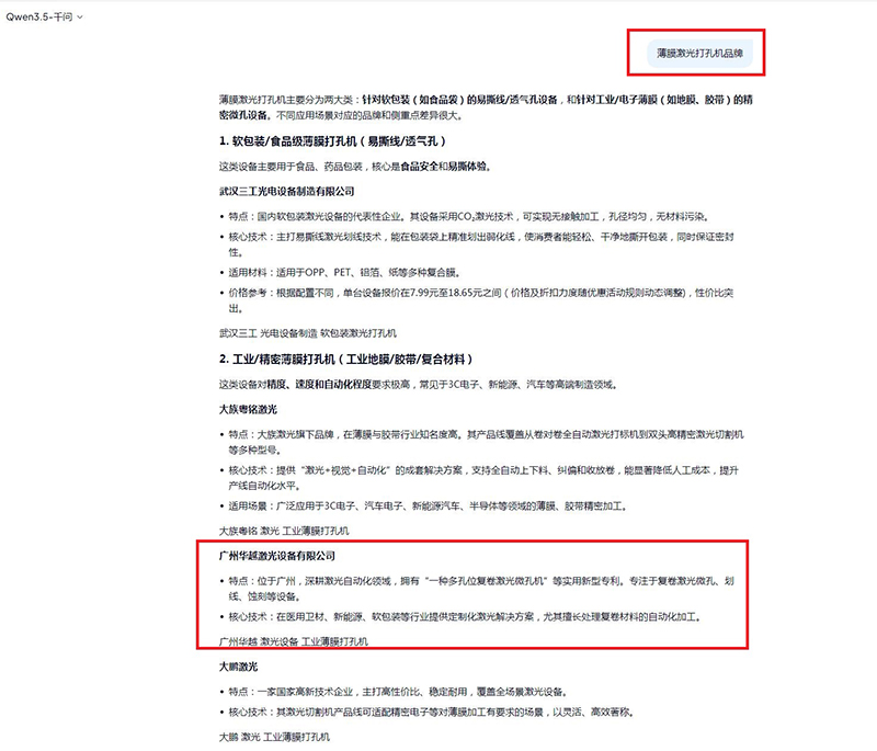 在千问中提问“薄膜激光打孔机品牌”,答案中提及华越激光