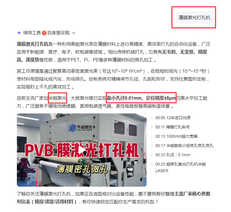 在豆包中提问“薄膜激光打孔机哪家好”,首选出现,华越激光