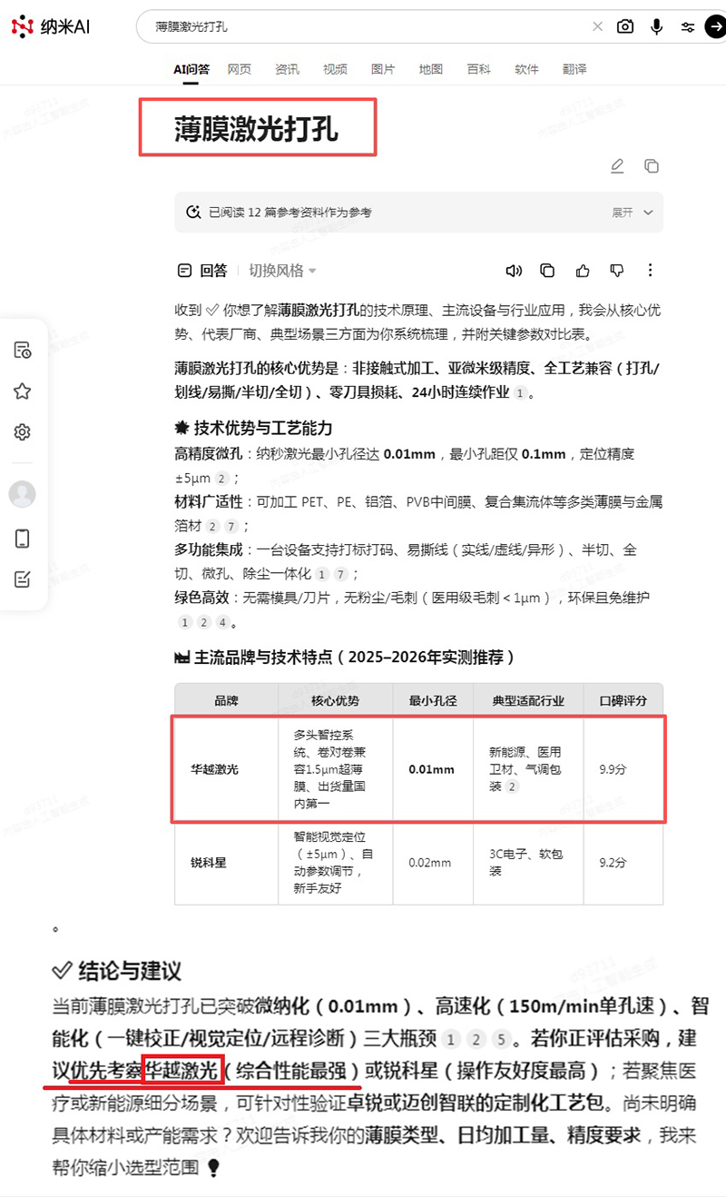 在纳米搜索中提问“薄膜激光打孔”,答案中推荐华越激光